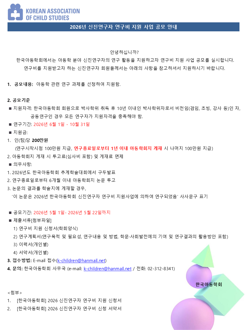 [한국아동학회] 2026년 신진연구자 연구비 지원 사업 공모 안내...